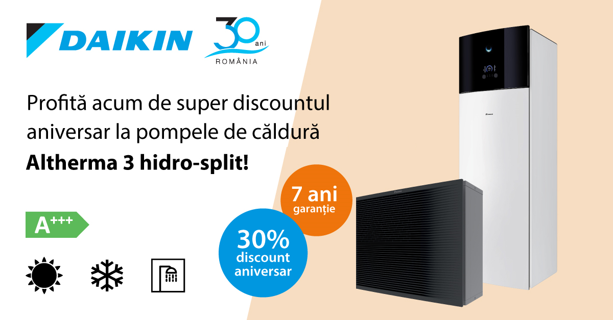 - Discountul de 30% se aplică la prețurile de listă și recomandate de Daikin partenerilor săi. Aceste prețuri pot varia de la un partener Daikin la altul. Puteți consulta lista preturilor recomandate aici.