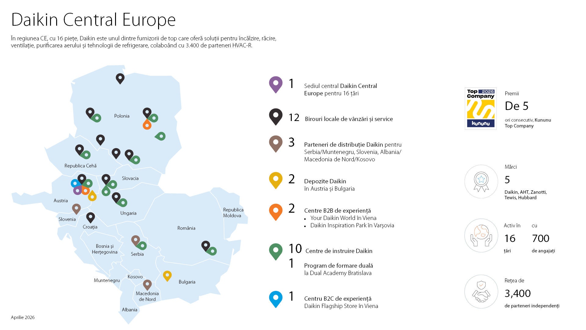 - Daikin Industries Ltd (grupul global), Daikin Europe N.V. (grupul EMEA) și Daikin Central Europe (regiunea CE care acoperă 16 piețe)
