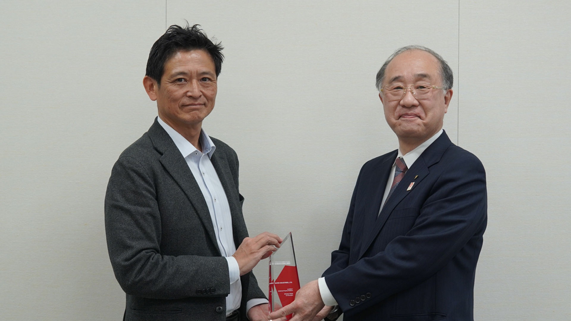 Masafumi Yamamoto (dreapta), Ofițer Senior Asociat responsabil de Strategia Globală privind Proprietatea Intelectuală la Daikin Industries, Ltd., primește premiul „Innovation Momentum 2025: The Global Top 100” din partea unui reprezentant LexisNexis.