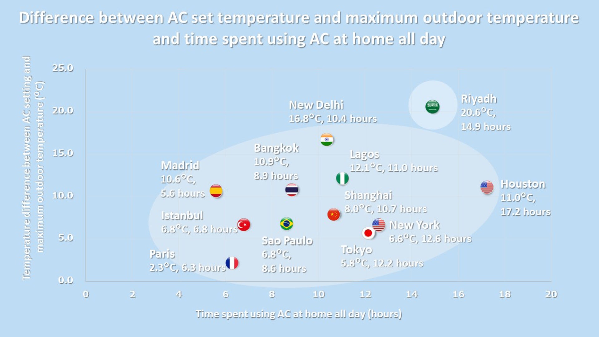 In Riyadh, the temperature difference between the AC setting and the maximum outdoor temperature reaches up to 20.6°C. During the hottest month, residents use AC for an average of 14.9 hours per day.
