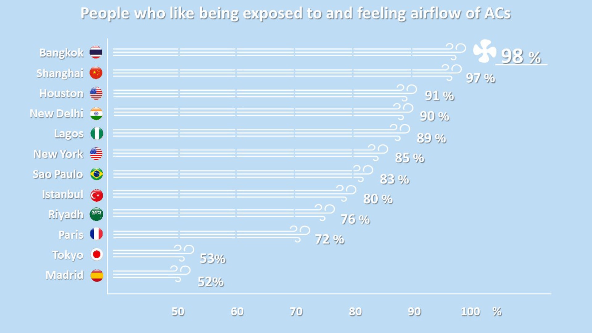 When asked about their opinion about feeling the airflow of air conditioners on their skin during hot weather, most people in most cities responded positively saying they “strongly like it” or “somewhat like it”. However, in Madrid and Tokyo, opinions were more mixed. In these cities, nearly half of the respondents liked the airflow, while the other did not, showing a clear division in preferences.
