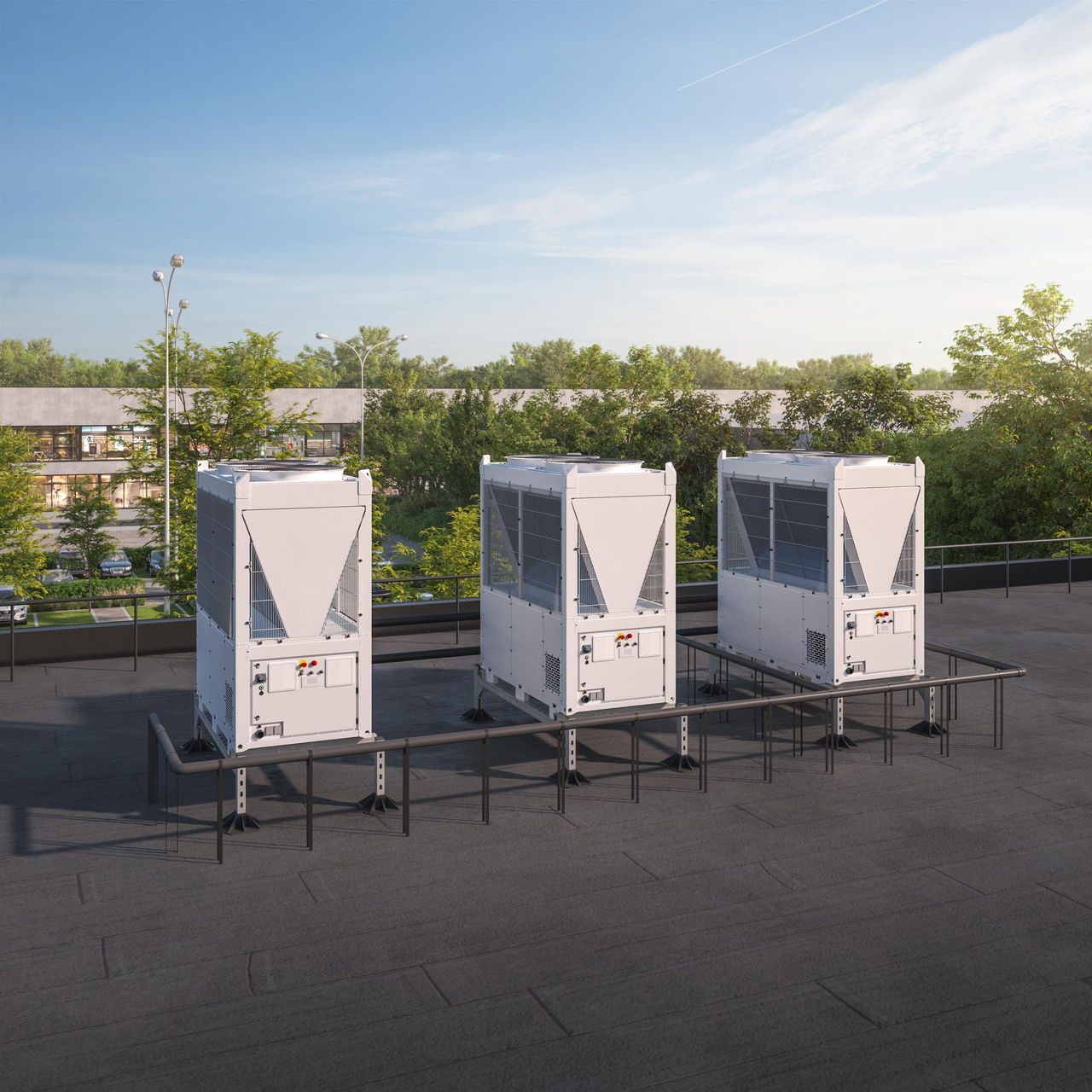 Unitățile sunt echipate standard cu compresoare scroll controlate prin inverter și ventilatoare fără perii EC*, permițând ajustarea continuă a capacității în funcție de cererea reală a sistemului. În combinație cu arhitectura modulară, această abordare asigură o funcționare deosebit de eficientă în condiții de sarcină parțială, tipice clădirilor moderne și multor procese industriale. Modulația continuă reduce ciclurile de pornire/oprire, contribuind la îmbunătățirea eficienței sezoniere și la stabilitatea operațională sporită pe tot parcursul anului.